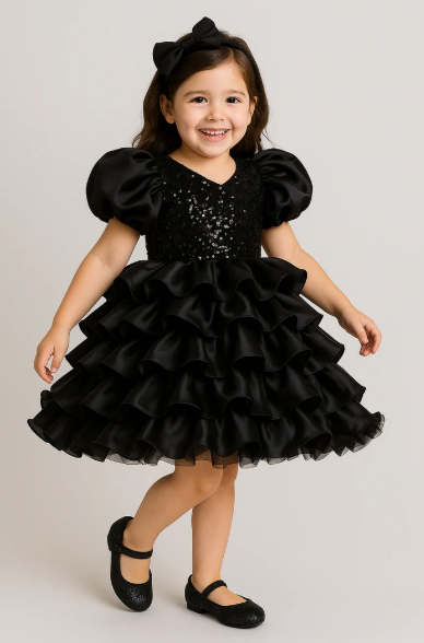 Make your little one shine in this stunning Black Sequin Ruffle Dress, designed to create an unforgettable look for special occasions. Featuring exquisite details and a voluminous tiered skirt, this dress offers both elegance and comfort for your child. Whether it’s a birthday, wedding, or holiday celebration, this dress will make your girl the star of the event.